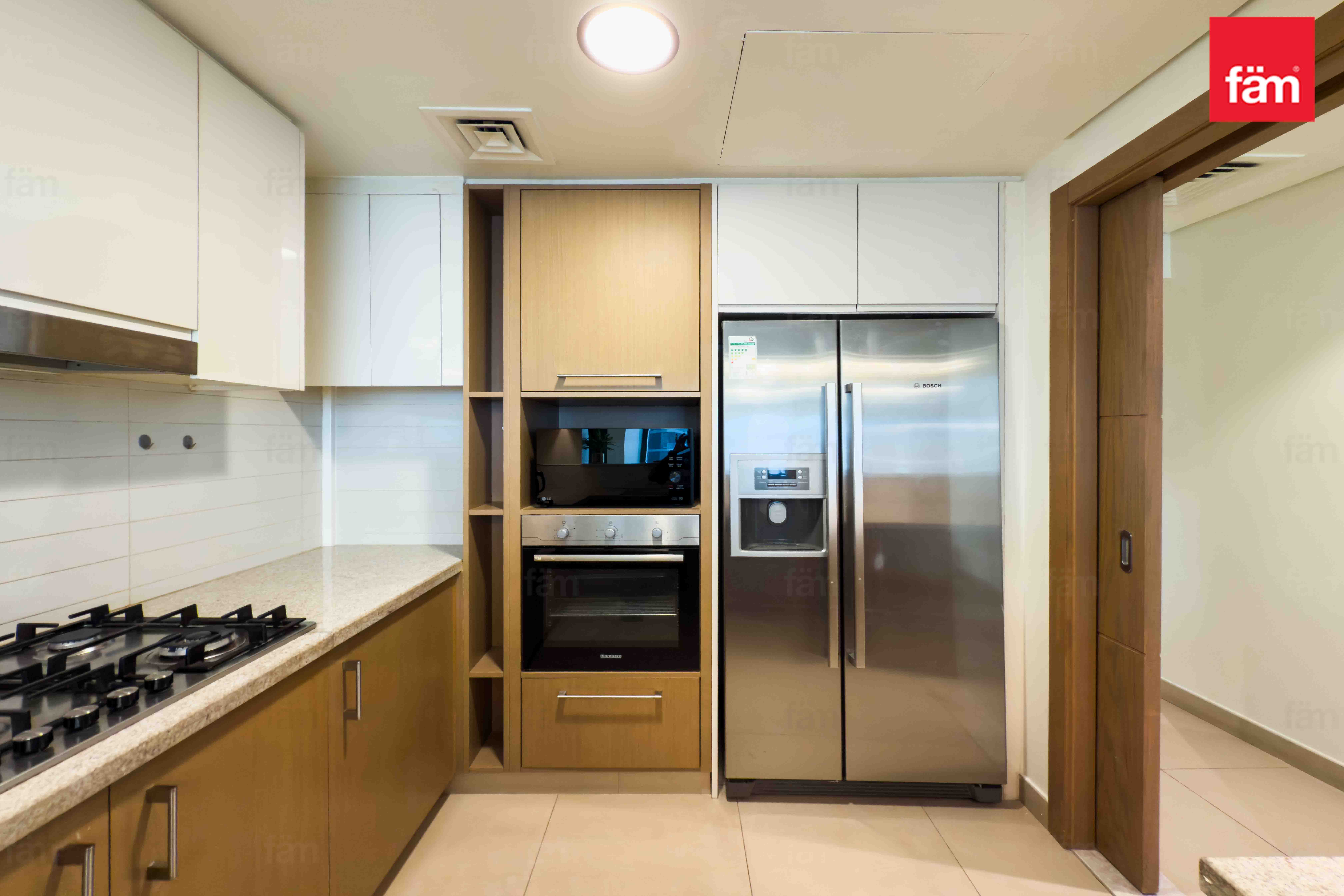 The apartment comes unfurnished, allowing tenants to customize the space to their preferences. It includes built-in wardrobes, a fully equipped kitchen with modern appliances, a maid’s room, and a dedicated storage room. The unit also offers a private balcony and walk-in closets for added convenience and luxury.